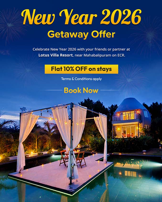 LOTUS VILLA Resort is a luxurious villa located in Mahabalipuram, ECR. It offers Bali-style architecture with fully furnished bedroom, 5-star standard mattresses, modern amenities like Wi-fi, TV, Music System, Well-Equipped Kitchen, Swimming Pool, Cabana and Sea-View Balcony. The Villa have a beach access which takes 5 minutes away. It's close to historical landmarks like Five Rathas and Shore Temple.